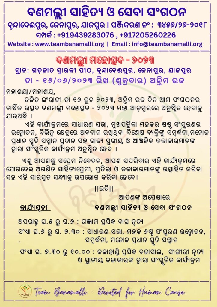Banamalli is going to celebrate its 9 years of journey on the biggest platform Banamalli Mahotsav 2023, June 16 this year at Gadajata Smaraki Peetha , Brundadeipur, Jenapur, Jajpur. The Program will be started at 5.00 PM with Ganjam Famous Bhaga Nacha ( Tiger Dance) General Meeting on Organisation activities, achievements and planning. Yearly Magazine […]
