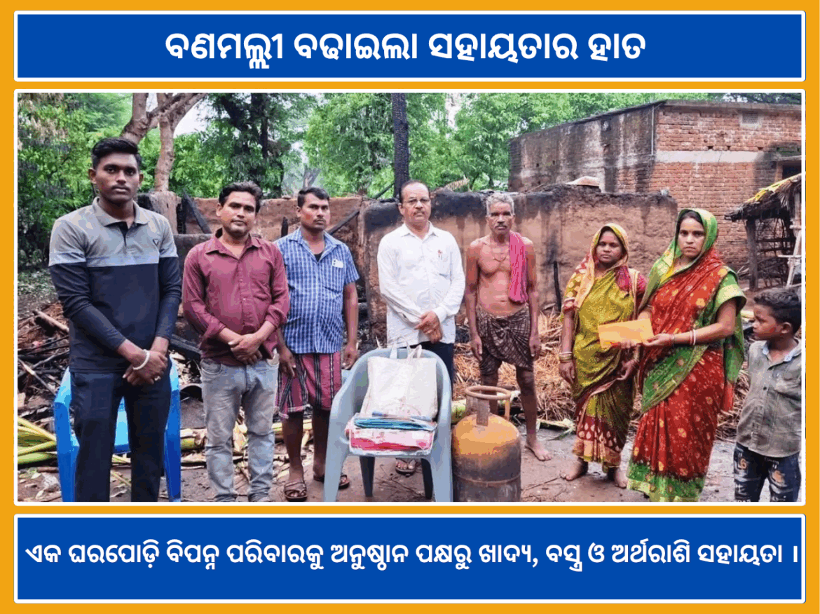 The house of Shri Nrusingh Charan Malik of Baramunduli village, in Dharamshala block under Puruna Boulmala Grama Panchayat, was completely destroyed in a fire caused by a gas cylinder explosion on the 26th. Along with the house, jewellery, furniture worth lakhs of rupees, and four goats were tragically lost in the blaze. The family has since been in a state of severe distress. Today, the Banamalli organization visited the affected family, assured them of support, and provided sarees, lungis, dry food, and some financial assistance.
